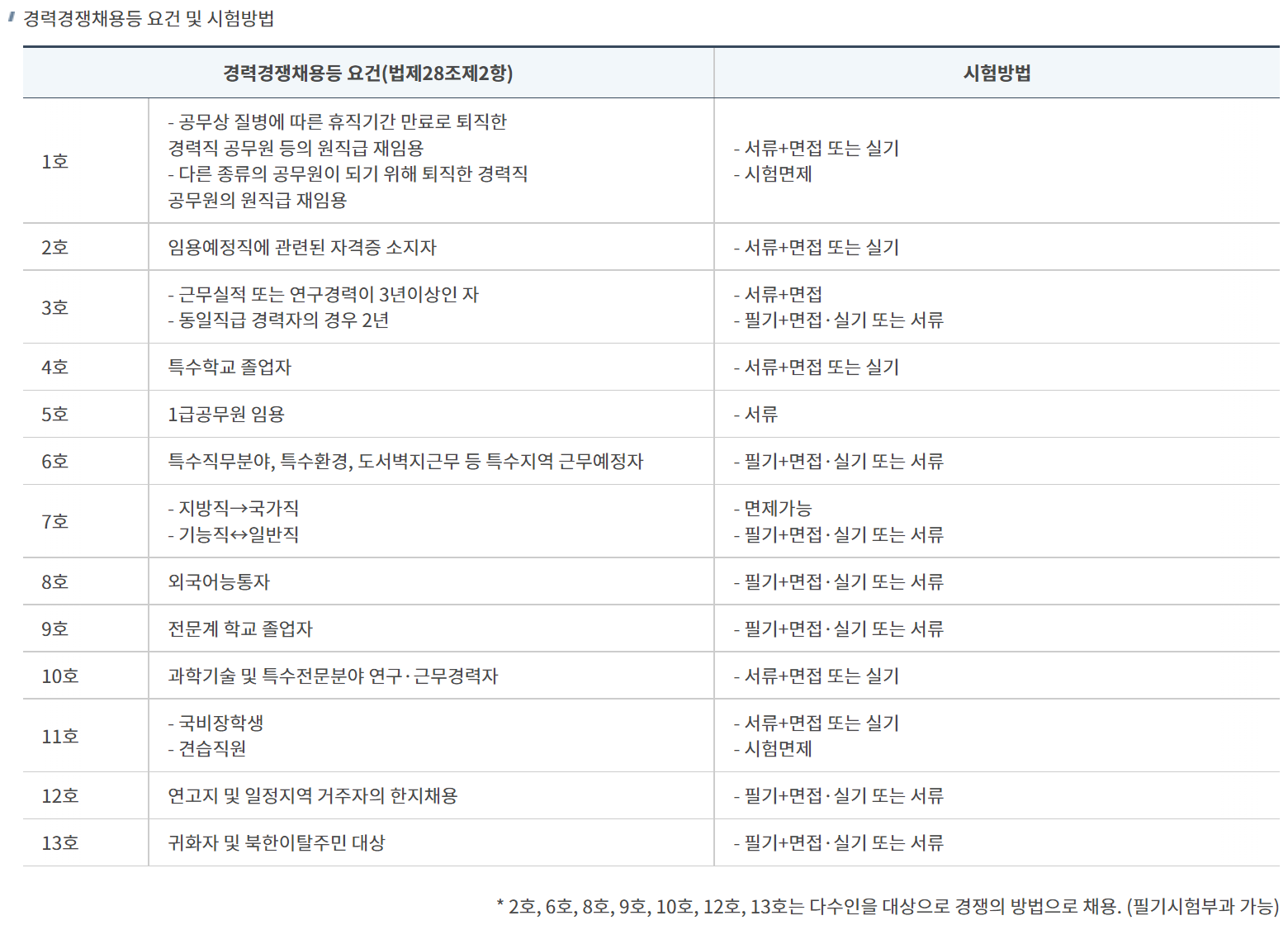 - 시험공고 → 응시원서접수 → 시험실시 → 합격자발표 → 채용후보자등록 → 임용추천/배치 → 임용