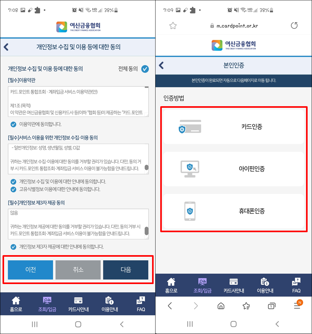 개인정보를 이용해서 조회를 해야하니 동의를 받는 화면이 나옵니다.