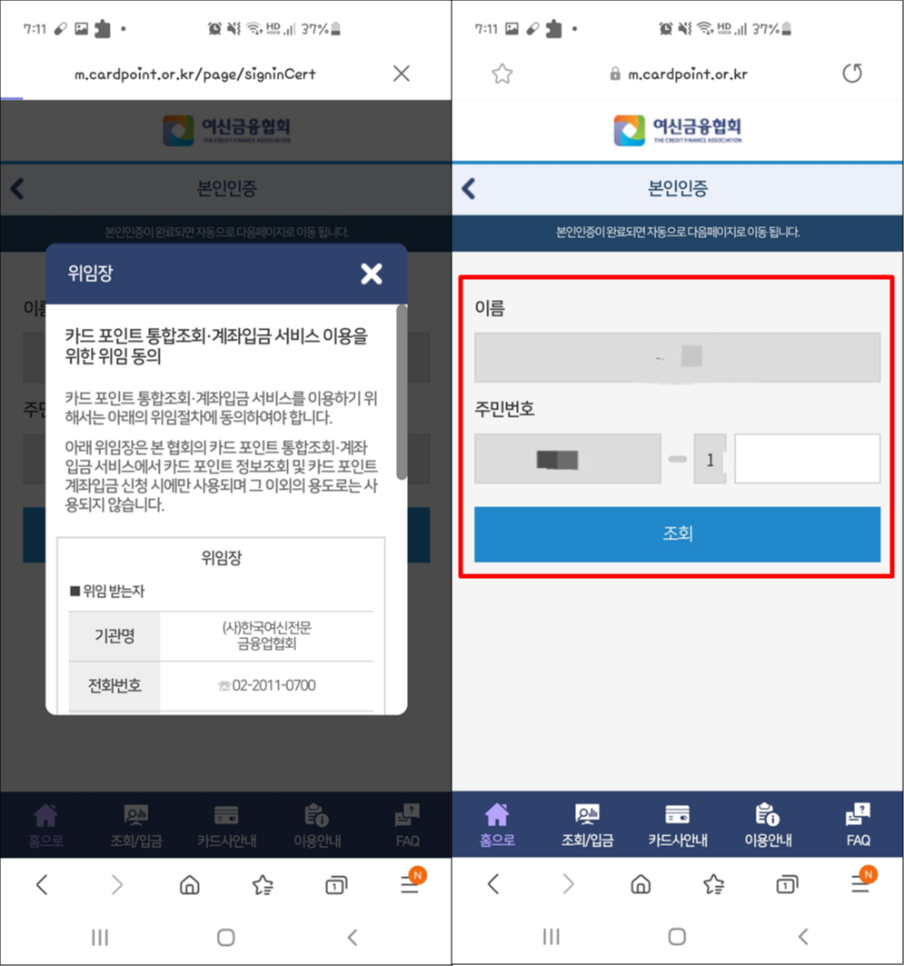 카드 포인트 통합조회,계좌입금 서비스 이용을 위한 위임 동의 화면입니다.