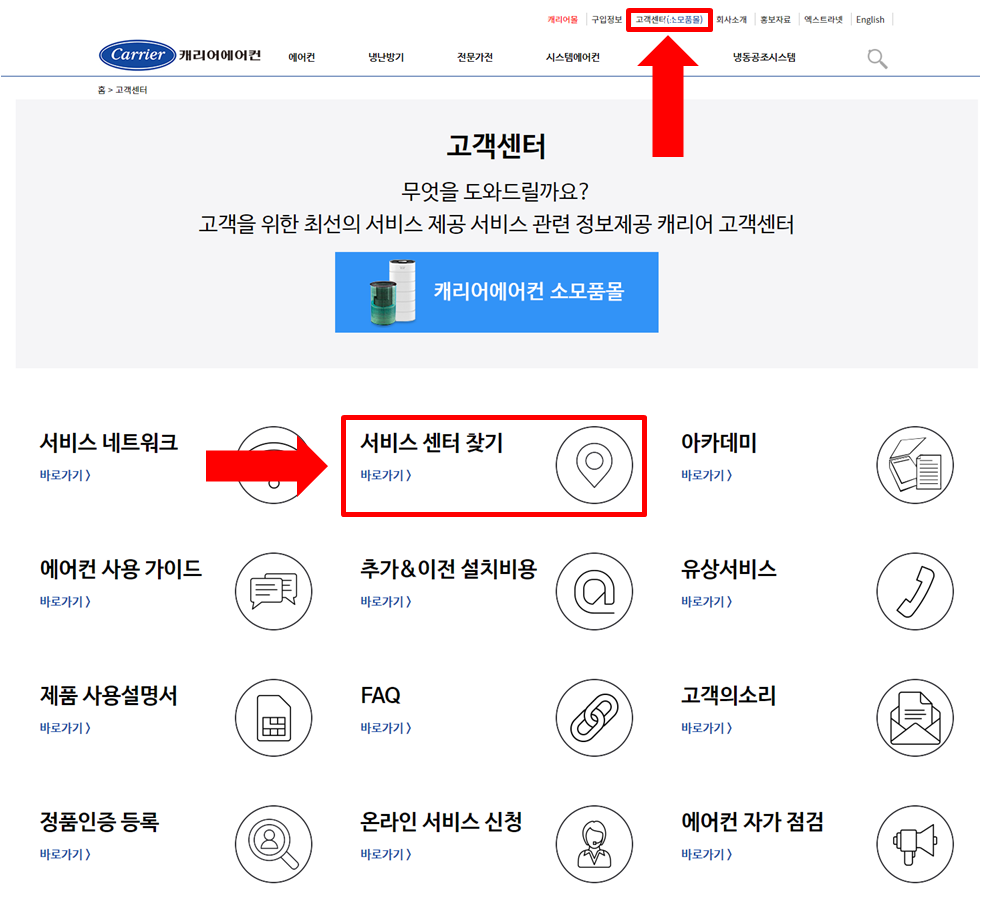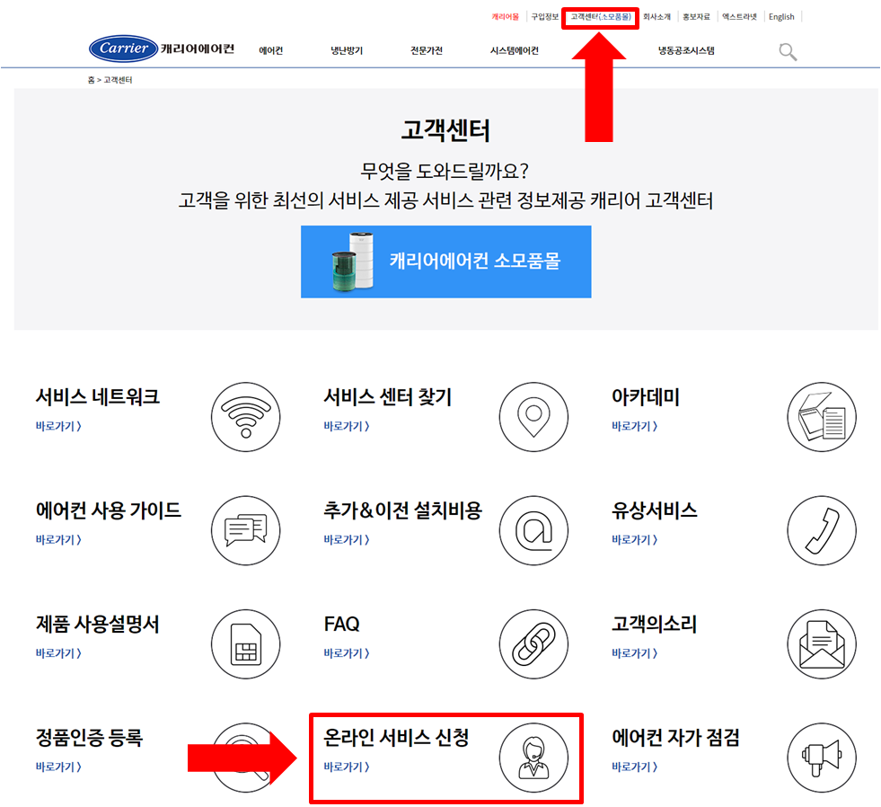 홈페이지에 상단에 보시면 "고객센터(소모품 몰)"이라는 카테고리가 있습니다. 여기로 클릭해서 들어가시면 아래와 같은 사진이 나오는데요, 제일 아래쪽에 "온라인 서비스 신청"을 통해 서비스를 접수하시면 됩니다.
